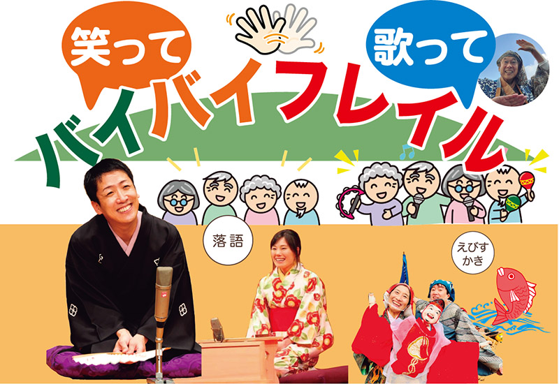 出演はベイコム「福丸がゆく」でお馴染みの桂福丸さん、福井県小浜市から女性落語家の若杯亭青葉さん、西宮神社のえびすかきを再興した人形芝居えびす座の武地秀実さん(人形遣い)と松田恵司さん(囃子方)、フレイル予防体操みんなげんきジムの山田美紀子さん、詩吟の東郷和美さん、歌声サロンはユニット3G(天満修一さん、米田和正さん、加藤鉄三郎さん)の皆さん、司会進行はくぐつ大道芸人の神楽亭米助でお送りします。